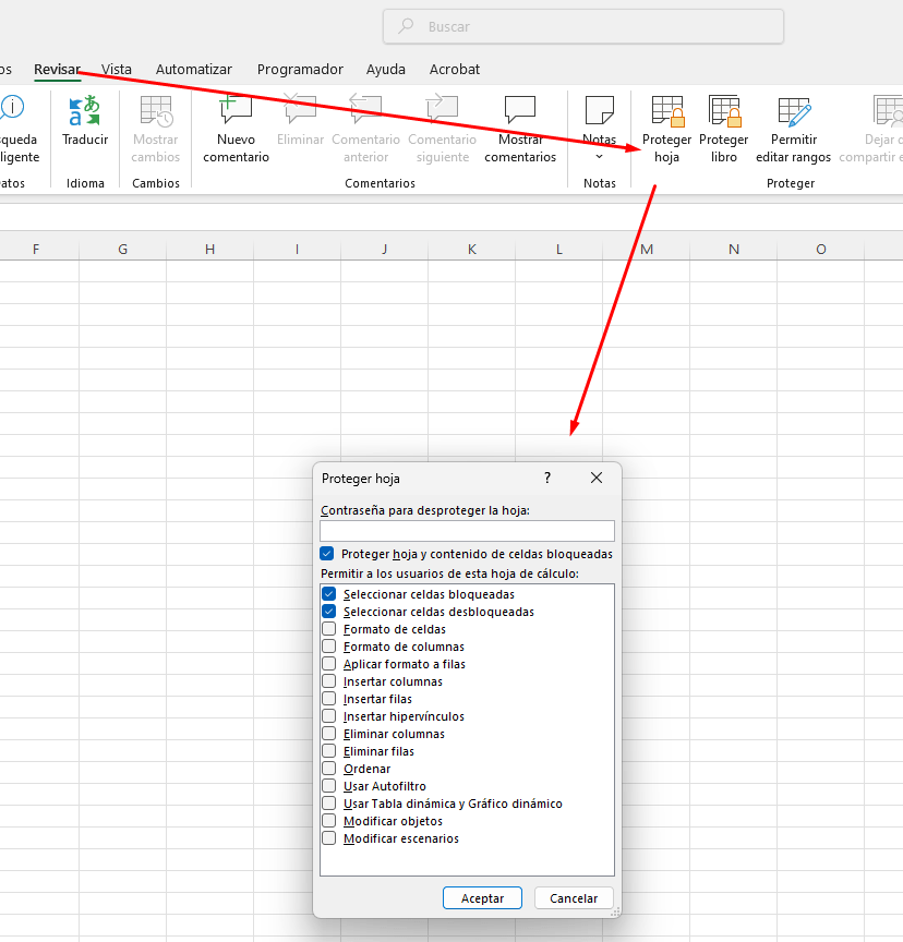 5. Luego, ve a Revisar > Proteger hoja y establece los permisos.