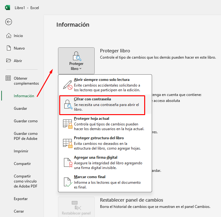 1. Ve a Archivo > Información > Proteger libro > Cifrar con contraseña.