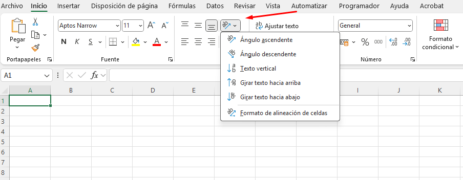 Excel facilita la rotación del texto con las opciones de Orientación, ubicadas en la pestaña Inicio dentro del grupo Alineación.