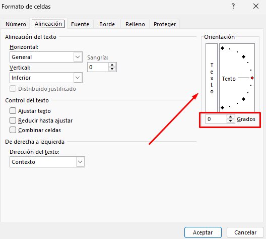 Si necesitas un ángulo de rotación específico, el cuadro de diálogo Formato de celdas te brinda opciones avanzadas.